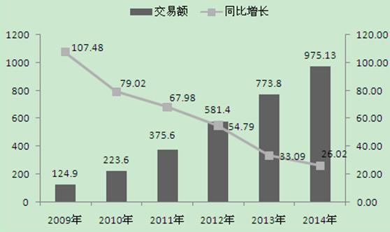 據(jù)前瞻產(chǎn)業(yè)研究院發(fā)布的《 2015-2020年互聯(lián)網(wǎng)對(duì)中國(guó)化妝品零售行業(yè)的機(jī)遇挑戰(zhàn)與應(yīng)對(duì)策略專(zhuān)項(xiàng)咨詢(xún)報(bào)告》數(shù)據(jù)顯示,網(wǎng)購(gòu)化妝品交易額從2009年的124.9億元到2014年的975.1億元。短短五年時(shí)間實(shí)現(xiàn)了一個(gè)大的翻越, 2013年較2012年增長(zhǎng)192.4億元,同比增長(zhǎng)33.09%;2014年較2013年增長(zhǎng)201.3億元,同比增長(zhǎng)26.02%。