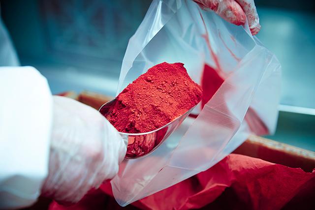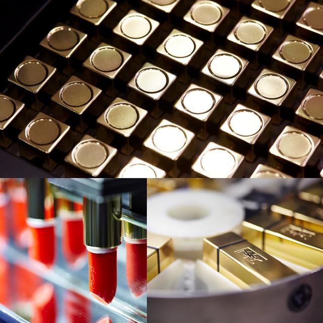 之后,固化的唇膏模在90°C的高溫下再加熱90分鐘,以取得最佳溫度和穩(wěn)定度。加熱后,將唇膏注入模具中成型。瞬間冷卻固化后,無需片刻等待子彈狀唇膏即固定于管中,再放入各自的包裝盒,最后蓋上金色瓶蓋。