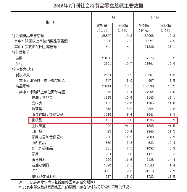 國(guó)家統(tǒng)計(jì)局同時(shí)匯總了上半年的整體數(shù)據(jù):2016年1-7月,社會(huì)消費(fèi)品零售總額182966億元,同比名義增長(zhǎng)10.3%;1-7月化妝品零售總額1235億元,同比名義增長(zhǎng)8.9%。